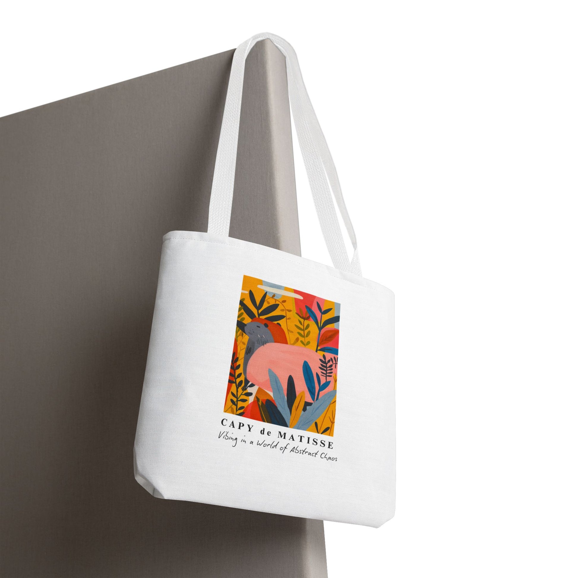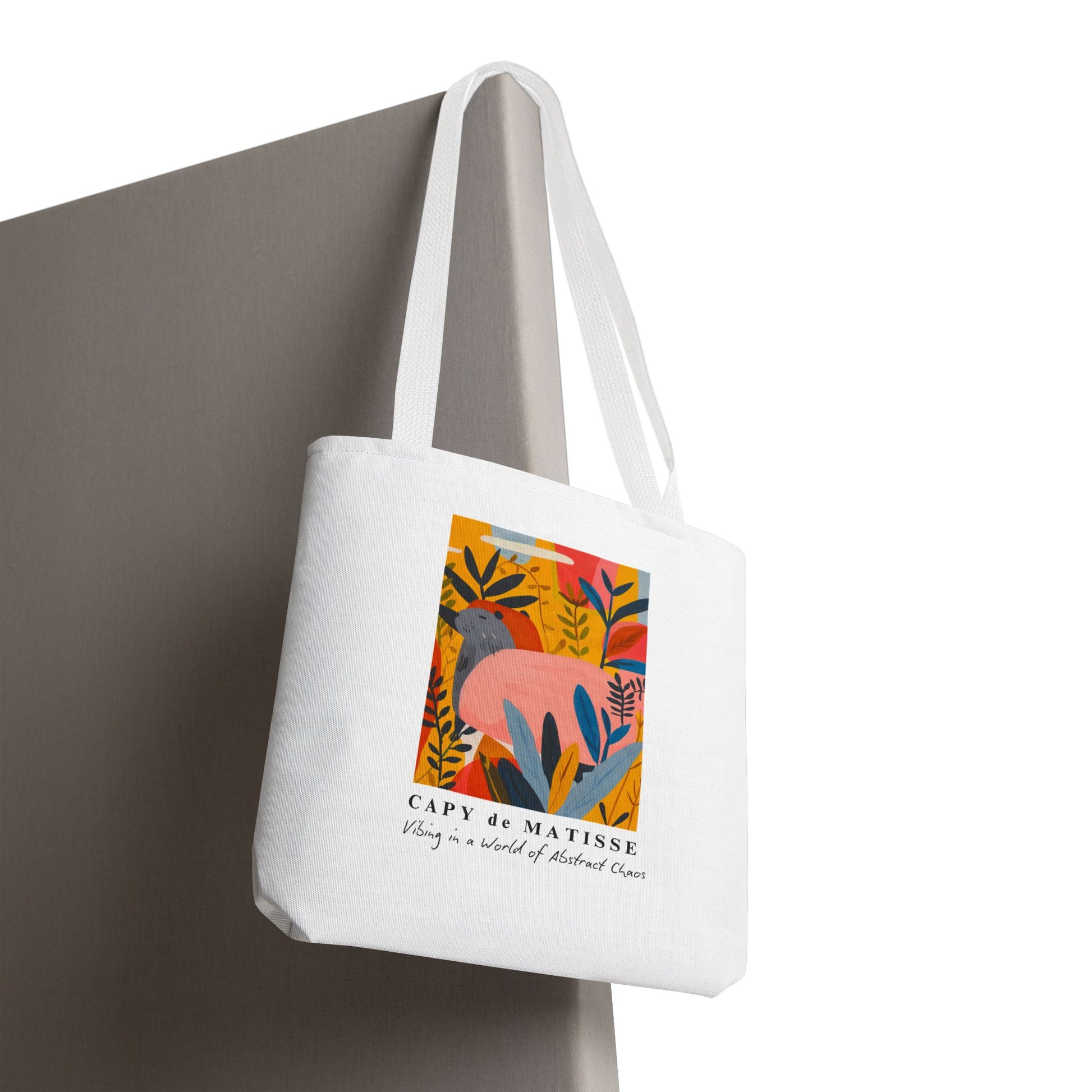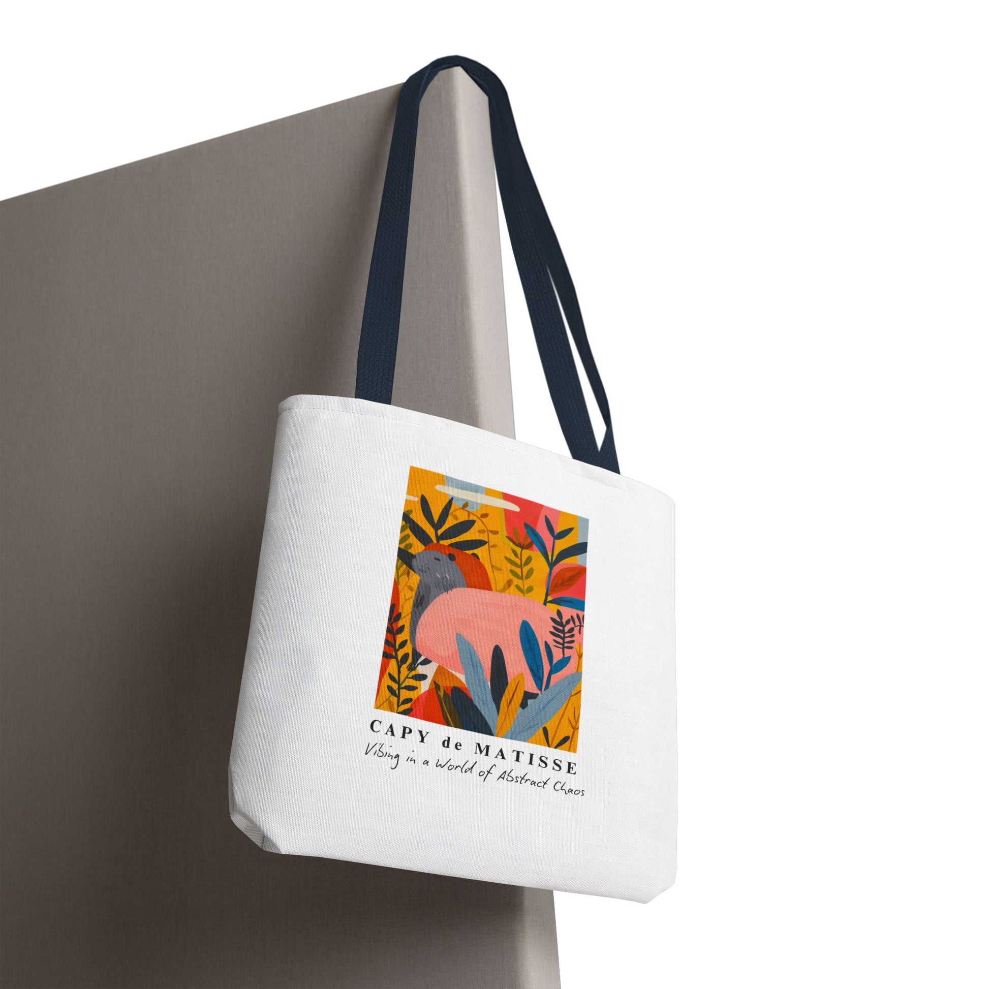 A tote bag featuring a graphic of a painting inspired by artist Henri Matisse, with a hidden capybara. Perfect for art lovers and capybara enthusiasts, this tote bag adds a touch of artistic flair to your everyday errands. Great for carrying books, groceries, or daily essentials. Ideal for art enthusiasts, animal lovers, and those looking to add a pop of creativity to their style. Perfect for gifting on birthdays, holidays, or as a treat for yourself.