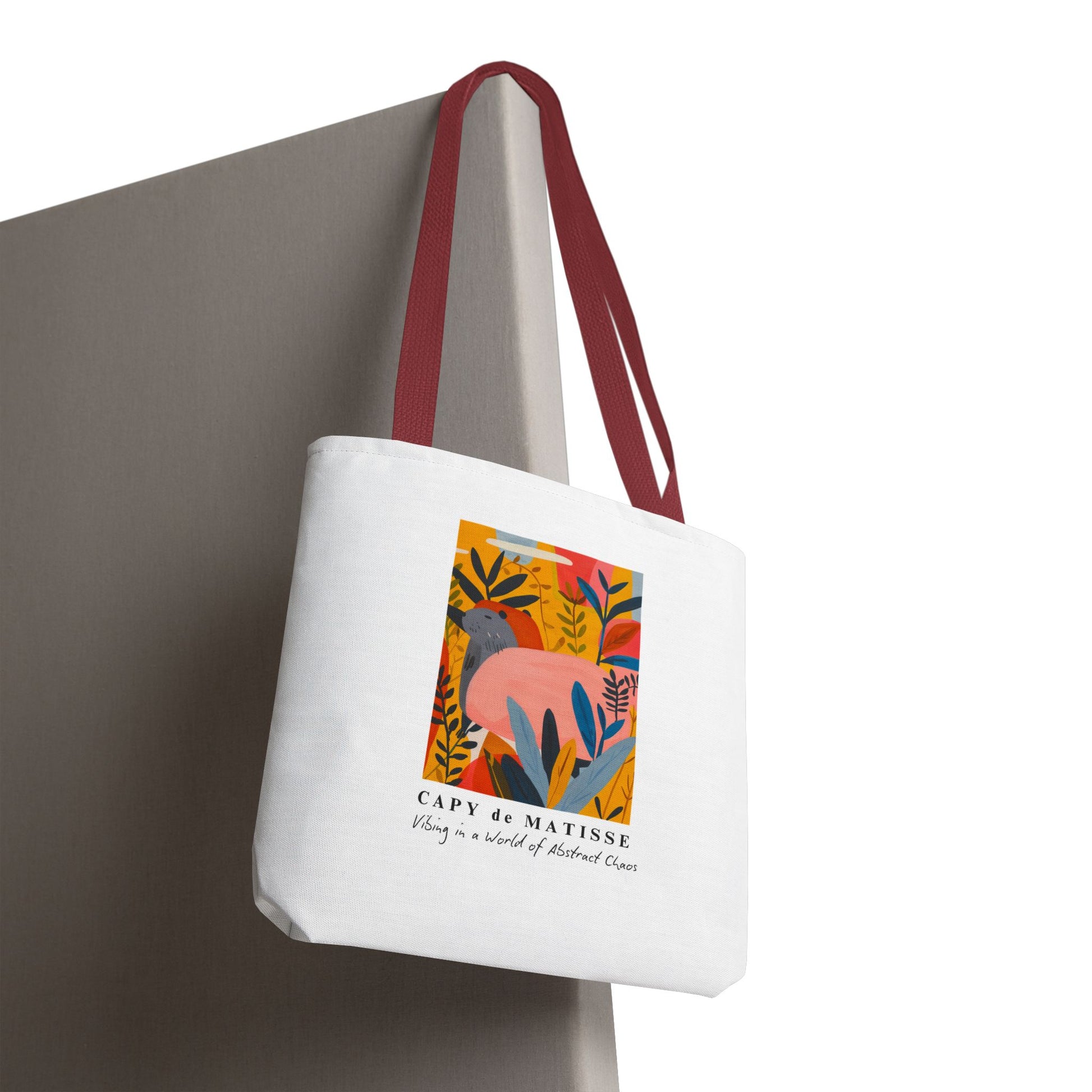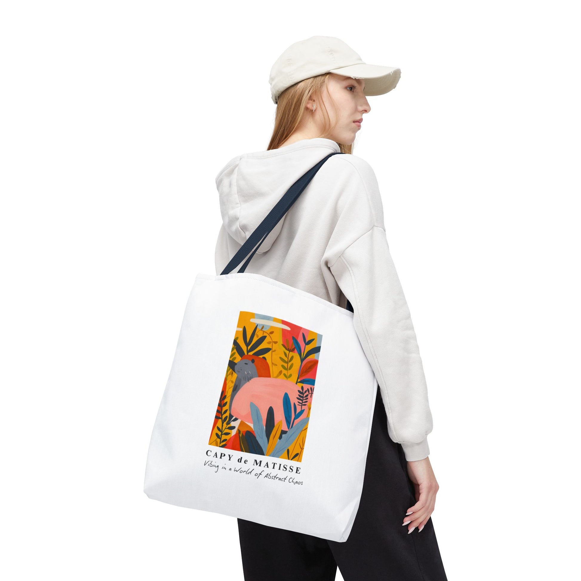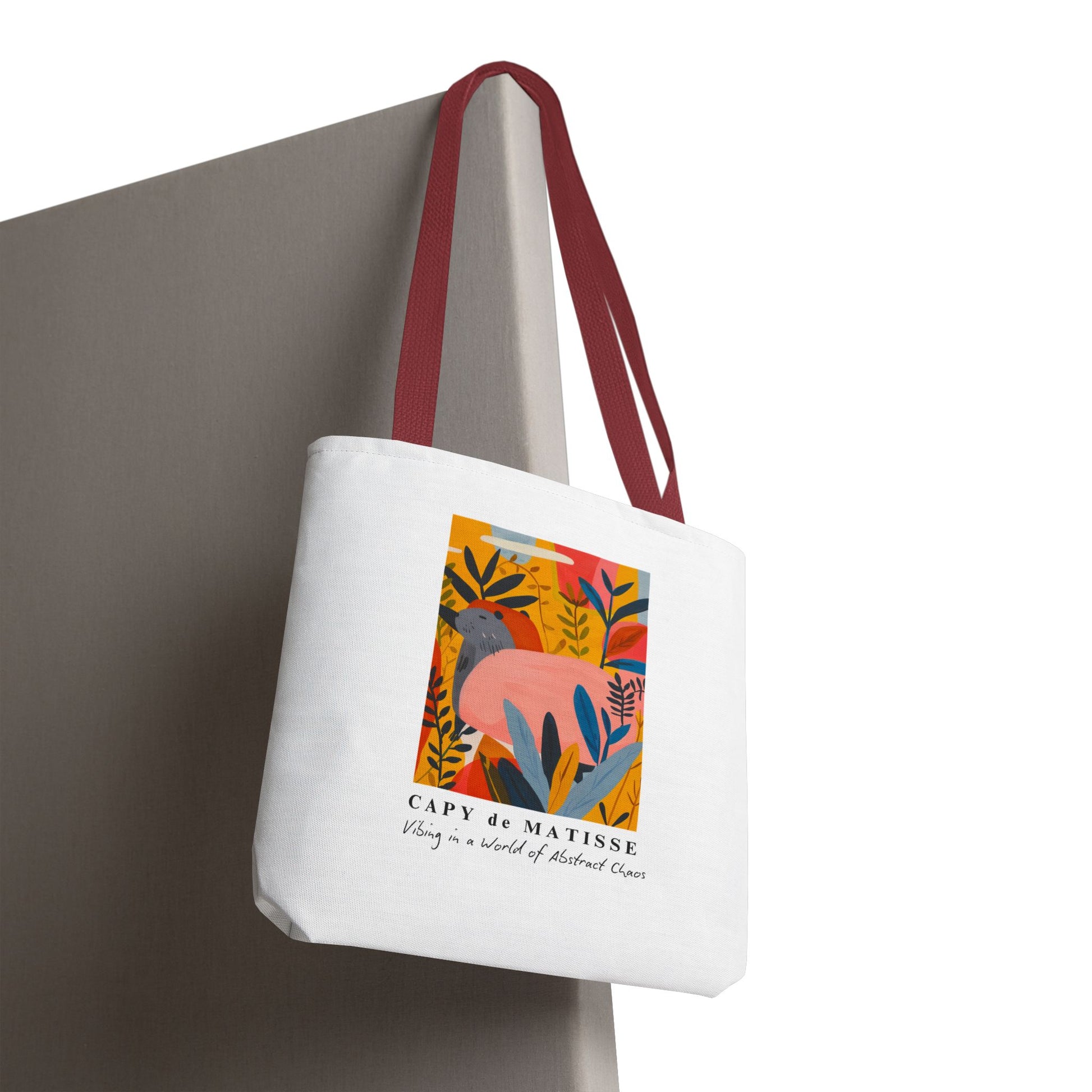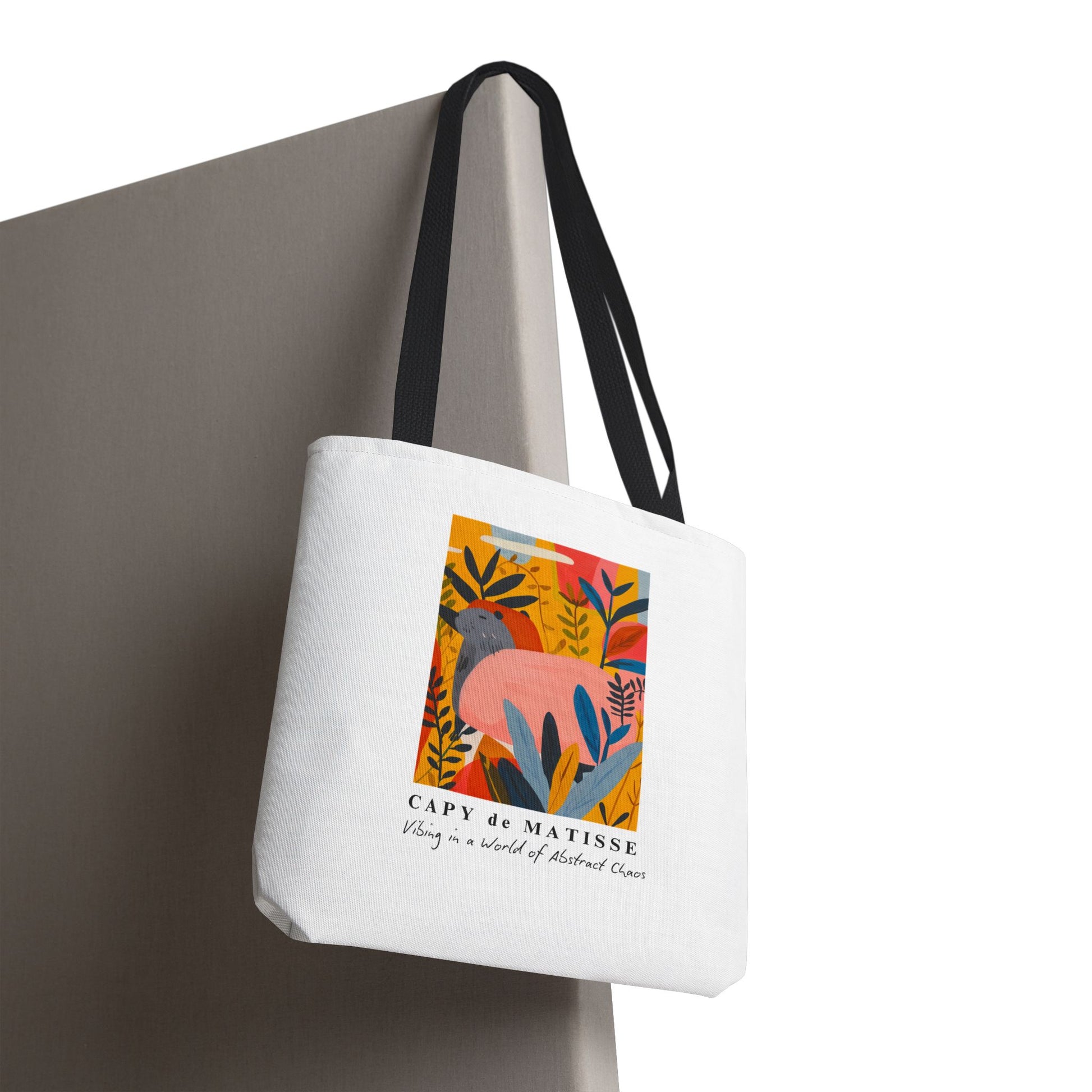 A tote bag featuring a graphic of a painting inspired by artist Henri Matisse, with a hidden capybara. Perfect for art lovers and capybara enthusiasts, this tote bag adds a touch of artistic flair to your everyday errands. Great for carrying books, groceries, or daily essentials. Ideal for art enthusiasts, animal lovers, and those looking to add a pop of creativity to their style. Perfect for gifting on birthdays, holidays, or as a treat for yourself.