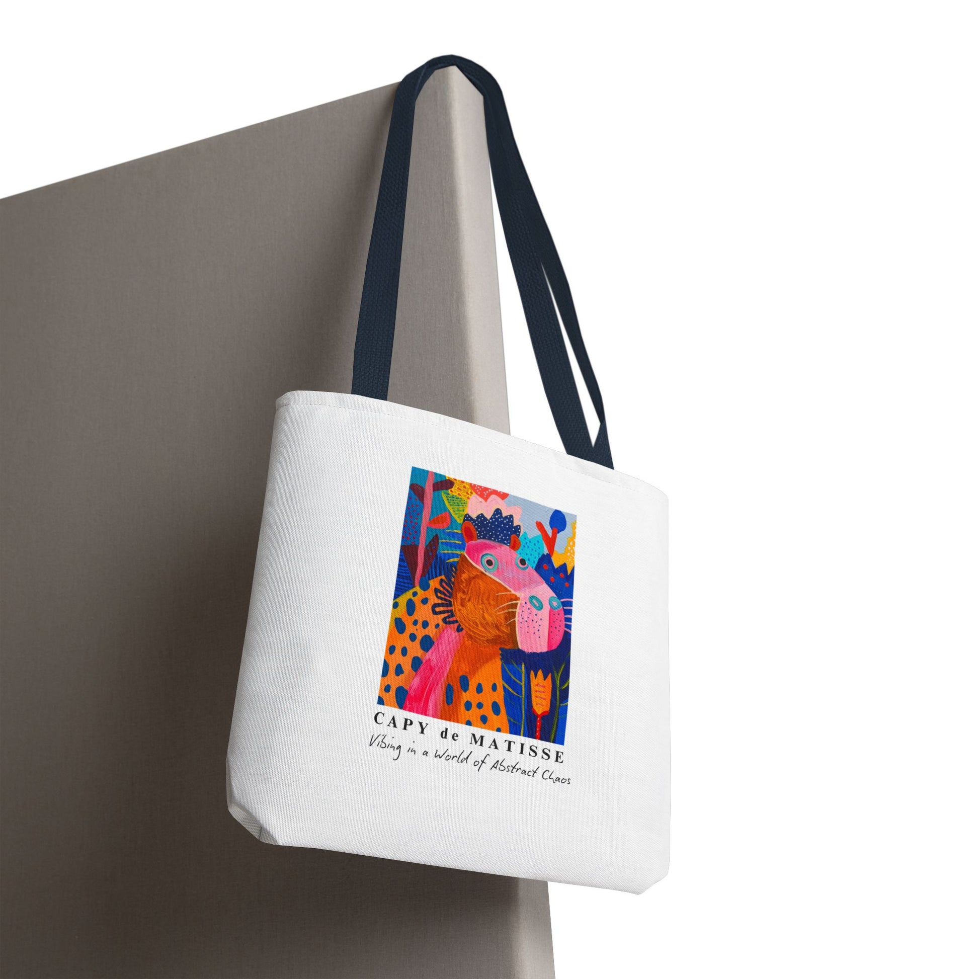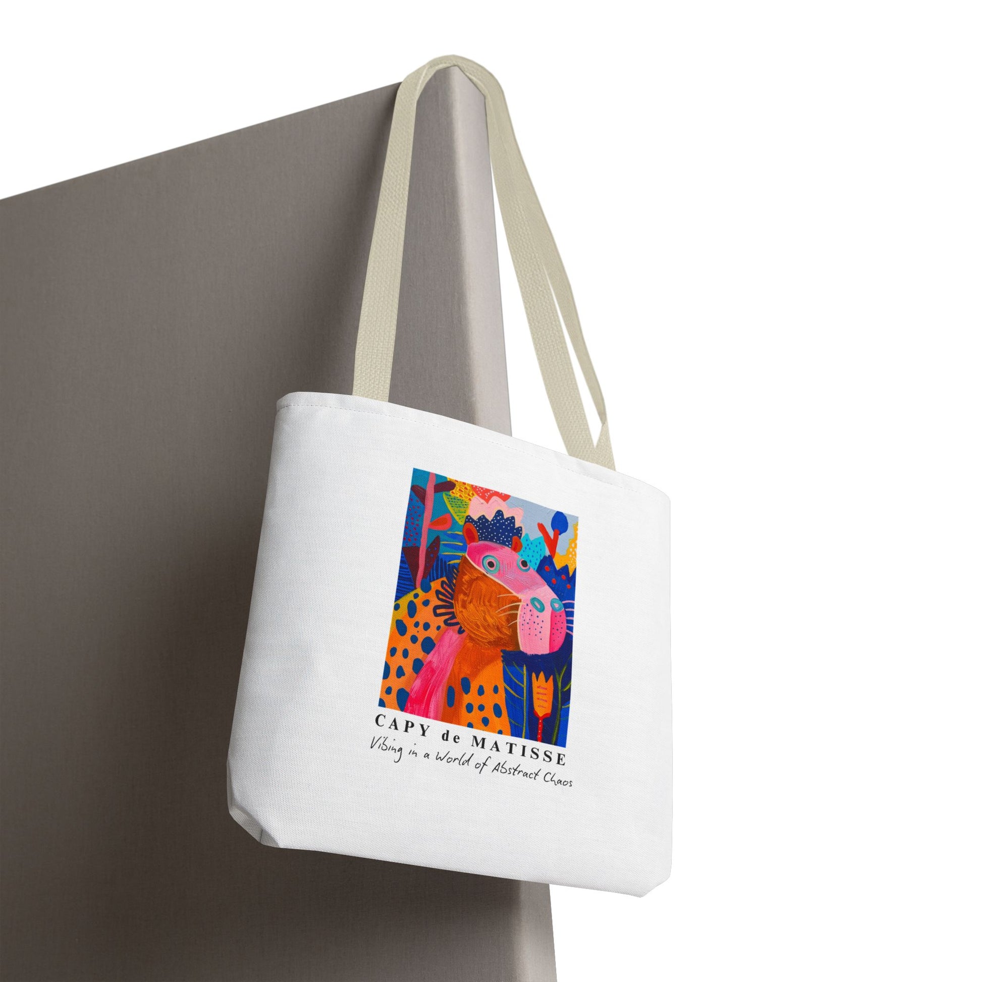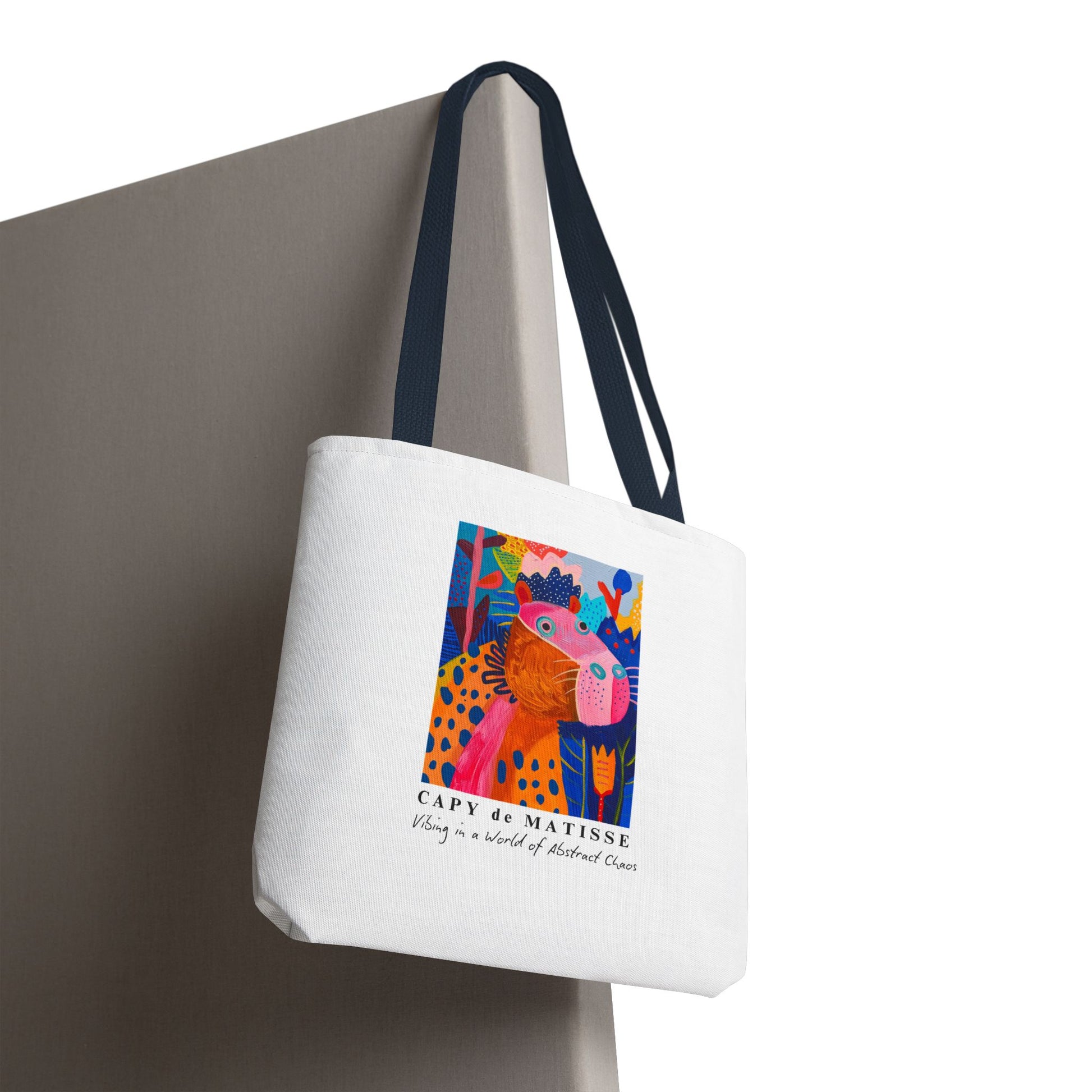 A tote bag featuring a graphic of a painting inspired by artist Henri Matisse, with a hidden capybara. Perfect for art lovers and capybara enthusiasts, this tote bag adds a touch of artistic flair to your everyday errands. Great for carrying books, groceries, or daily essentials. Ideal for art enthusiasts, animal lovers, and those looking to add a pop of creativity to their style. Perfect for gifting on birthdays, holidays, or as a treat for yourself.