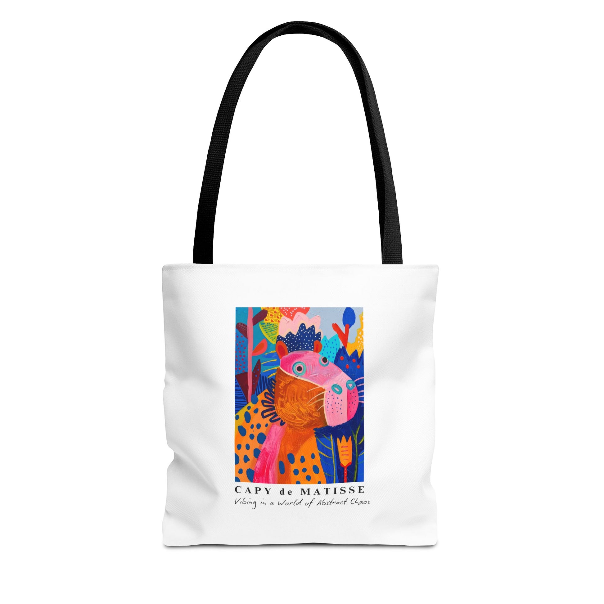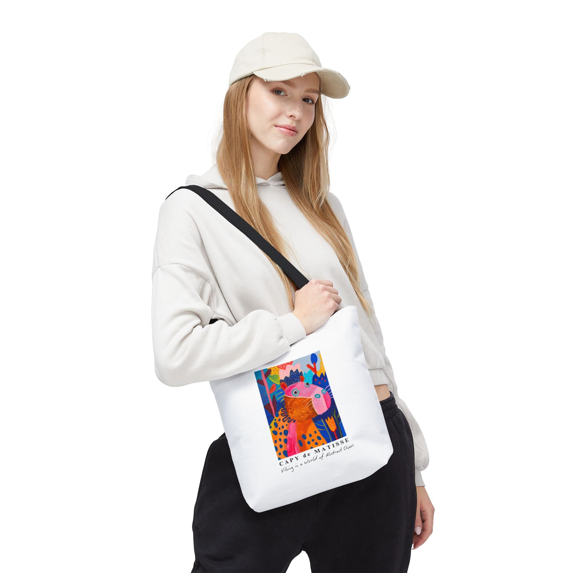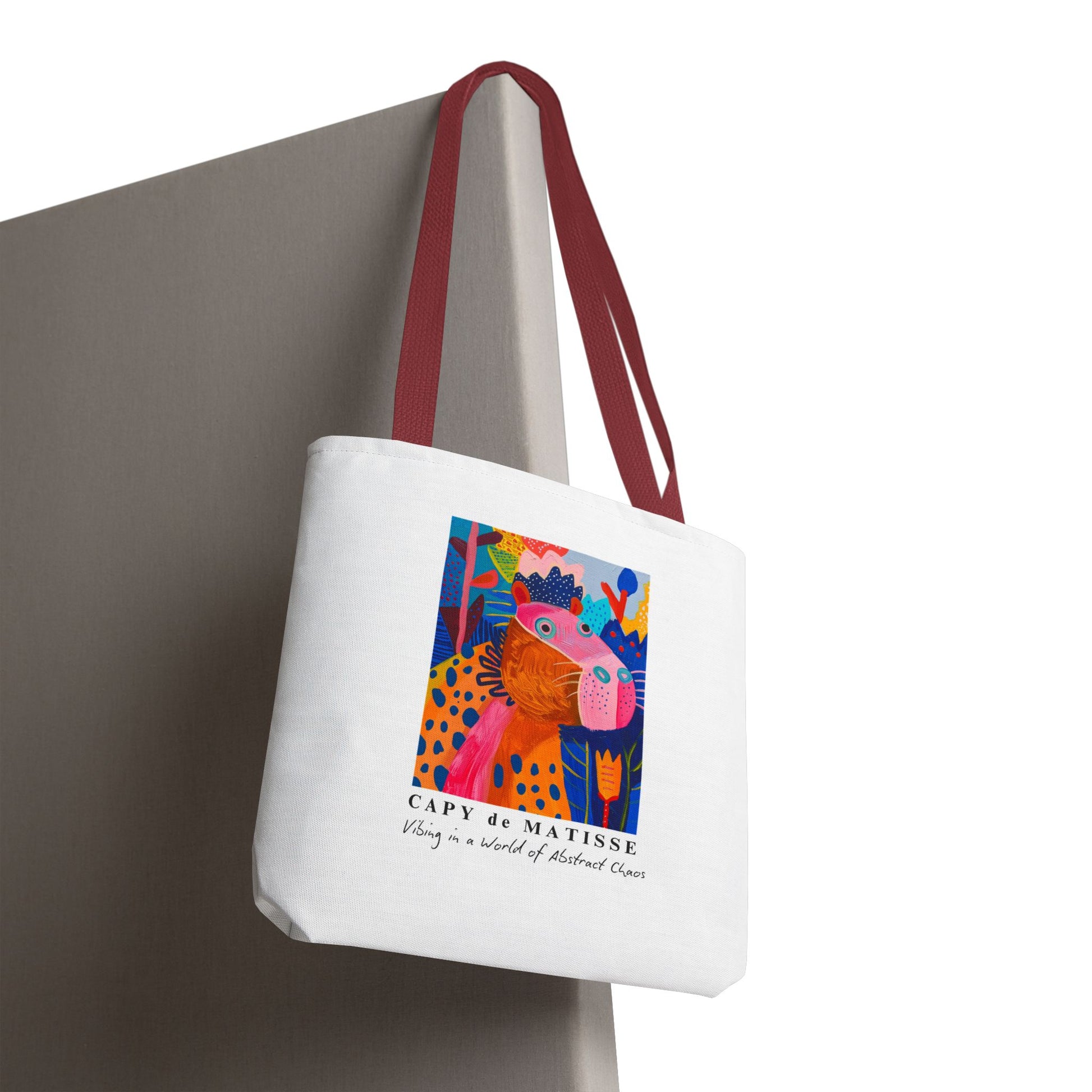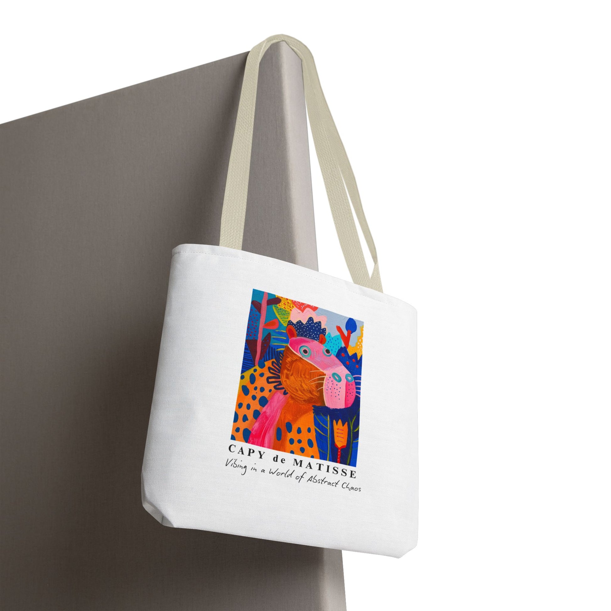 A tote bag featuring a graphic of a painting inspired by artist Henri Matisse, with a hidden capybara. Perfect for art lovers and capybara enthusiasts, this tote bag adds a touch of artistic flair to your everyday errands. Great for carrying books, groceries, or daily essentials. Ideal for art enthusiasts, animal lovers, and those looking to add a pop of creativity to their style. Perfect for gifting on birthdays, holidays, or as a treat for yourself.