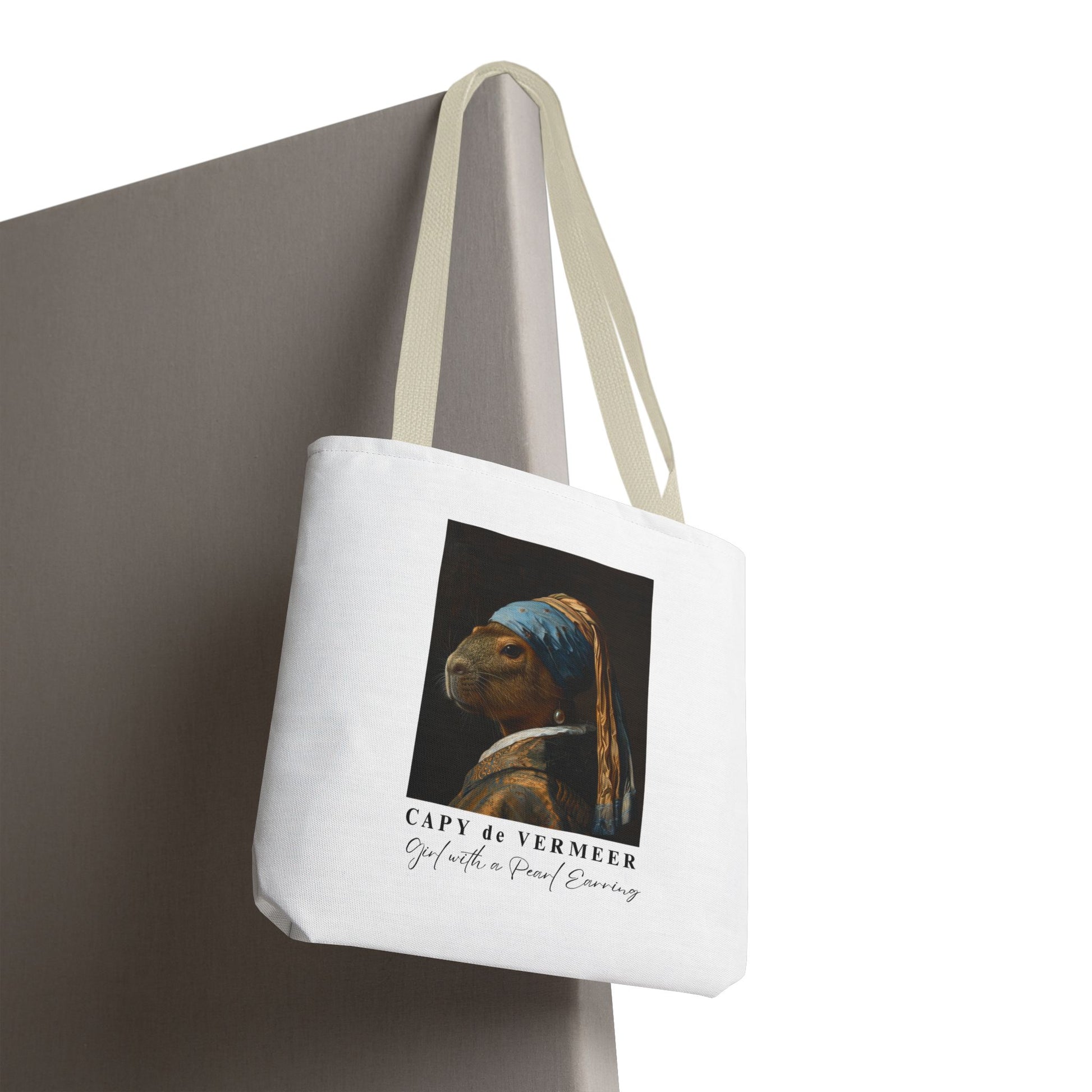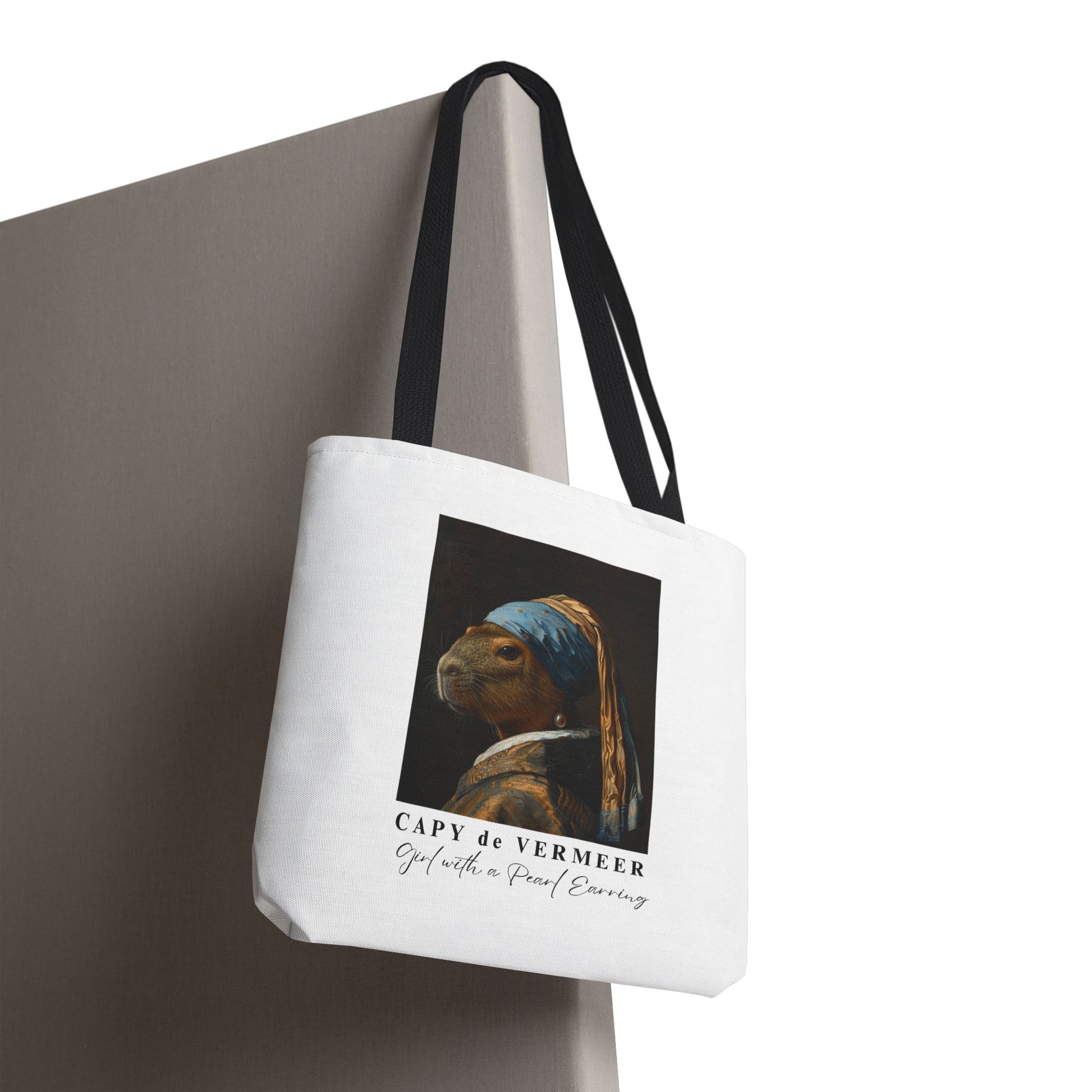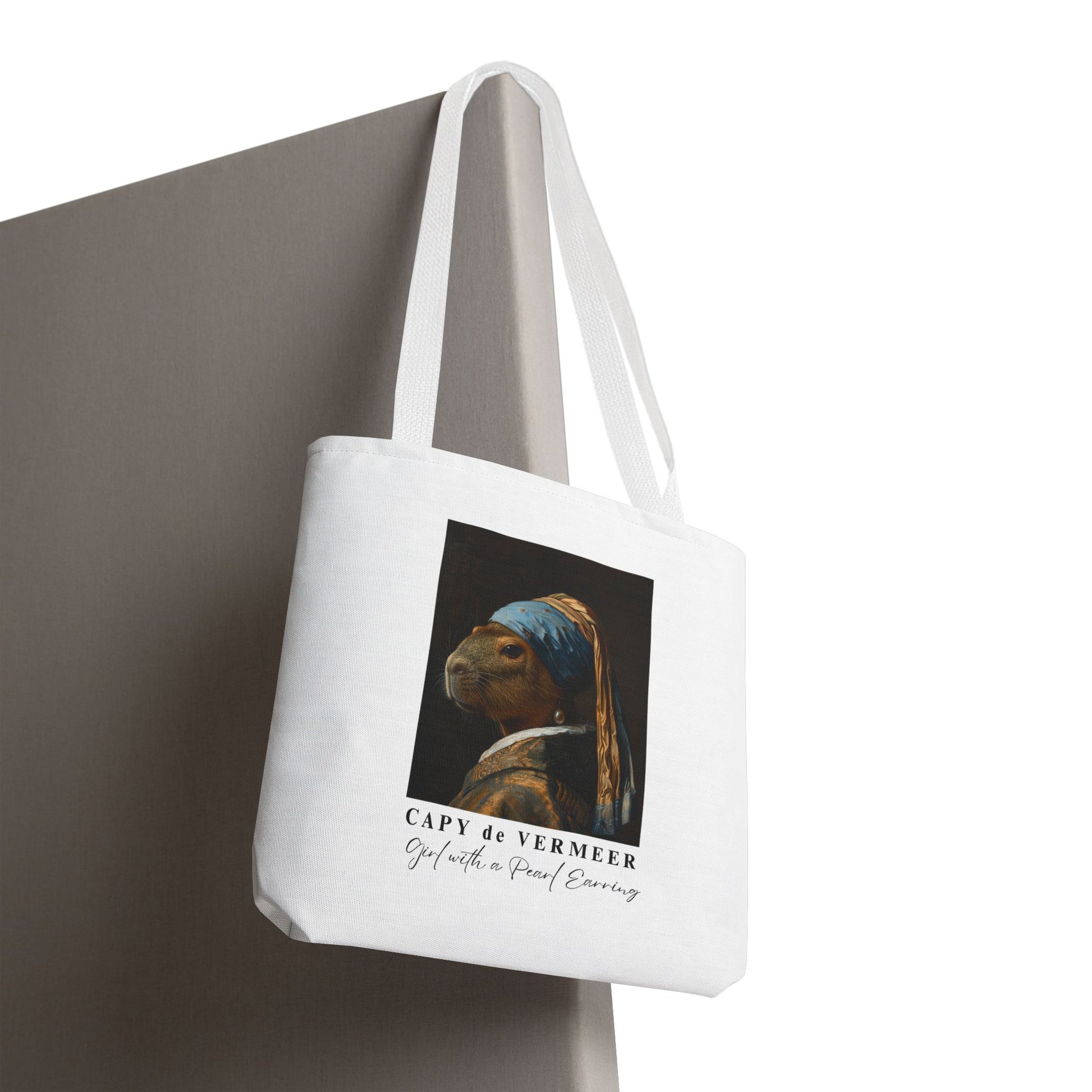 Turn an art classic into a playful statement with the Capy de Vermeer Tote Bag. Inspired by Vermeer’s timeless painting Girl with a Pearl Earring, this reimagined design swaps the girl for the world’s chillest muse — the capybara. The result is a witty, whimsical twist on one of history’s most iconic portraits.