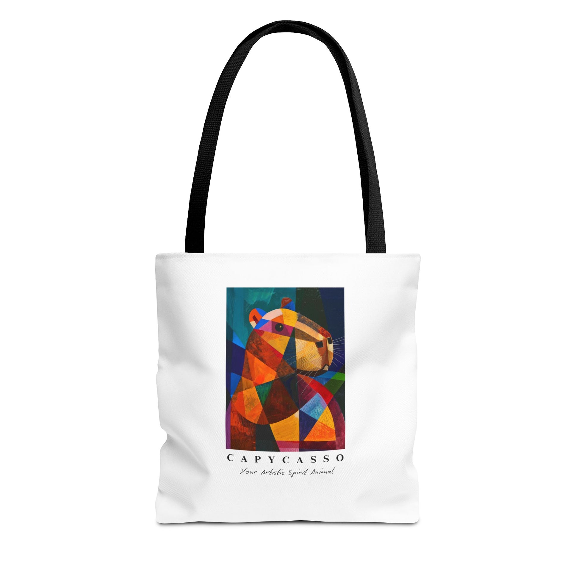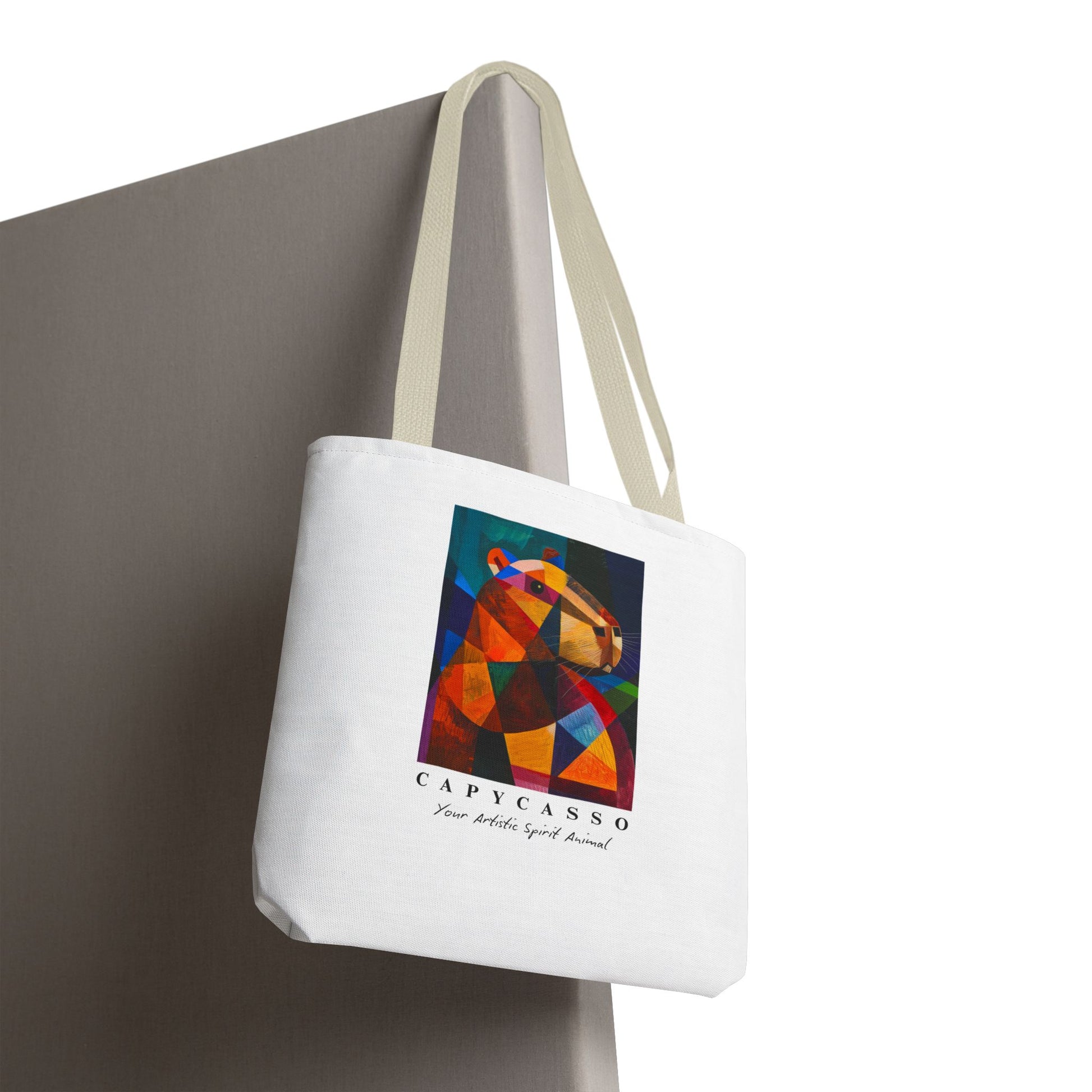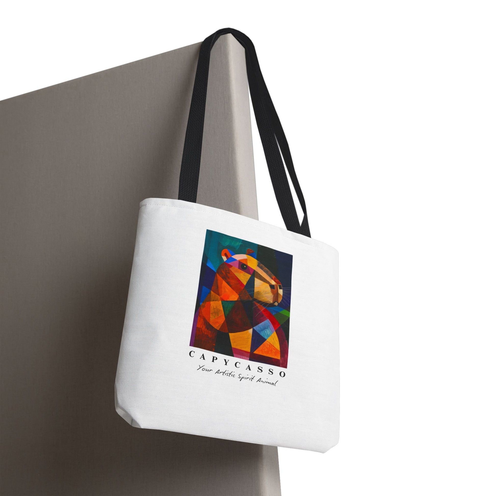 A tote bag featuring a painting inspired by Pablo Picasso, with abstract forms and geometric shapes. Perfect for art lovers and capybara enthusiasts, this tote bag adds a touch of artistic flair to your everyday errands. Great for carrying books, groceries, or daily essentials. Ideal for art enthusiasts, animal lovers, and those looking to add a pop of creativity to their style. Perfect for gifting on birthdays, holidays, or as a treat for yourself.