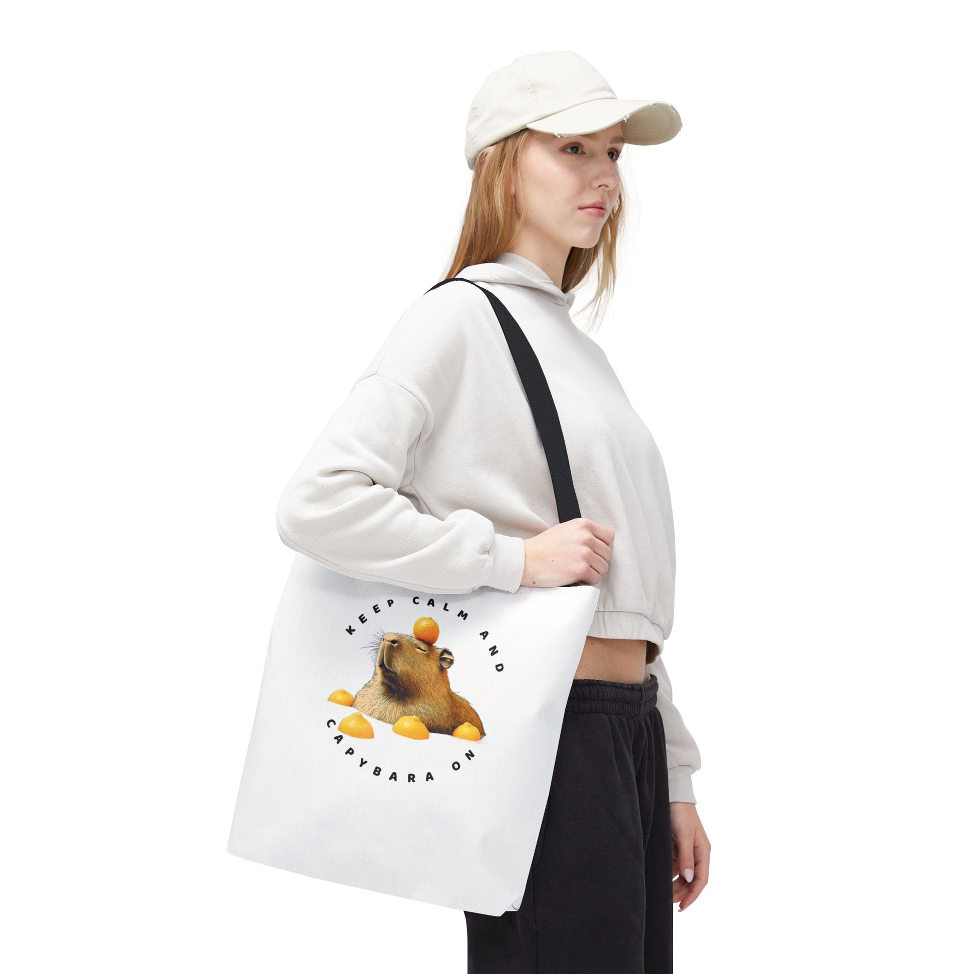 Stay relaxed in style with the Keep Calm and Capybara On tote bag. Featuring a relaxing capybara enjoying a yuzu bath, this tote bag is perfect for animal lovers and those who appreciate a laid-back vibe. It's great for everyday use, trips to the beach, picnics, or carrying groceries. Perfect for Capybara Day or as a fun gift for a friend.
